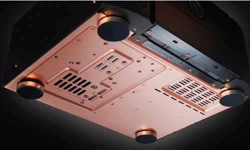 De uitgangsapparaten zijn bevestigd op onze unieke dubbele koelelementen van geëxtrudeerd aluminium in een tunnel die zowel passieve als actieve koeling biedt. De enorme koellichamen zijn voorzien van meerdere geribbelde vinnen die voor een groot passief koeloppervlak zorgen. Het geheel is voorzien van een geluidloze ventilator die automatisch aan gaat en stille actieve koeling levert als het geluidsspoor te warm wordt. Omdat de ventilator aan de binnenkant direct is bevestigd op de koellichamen, en niet aan de buitenkant op het chassis zoals vaak het g